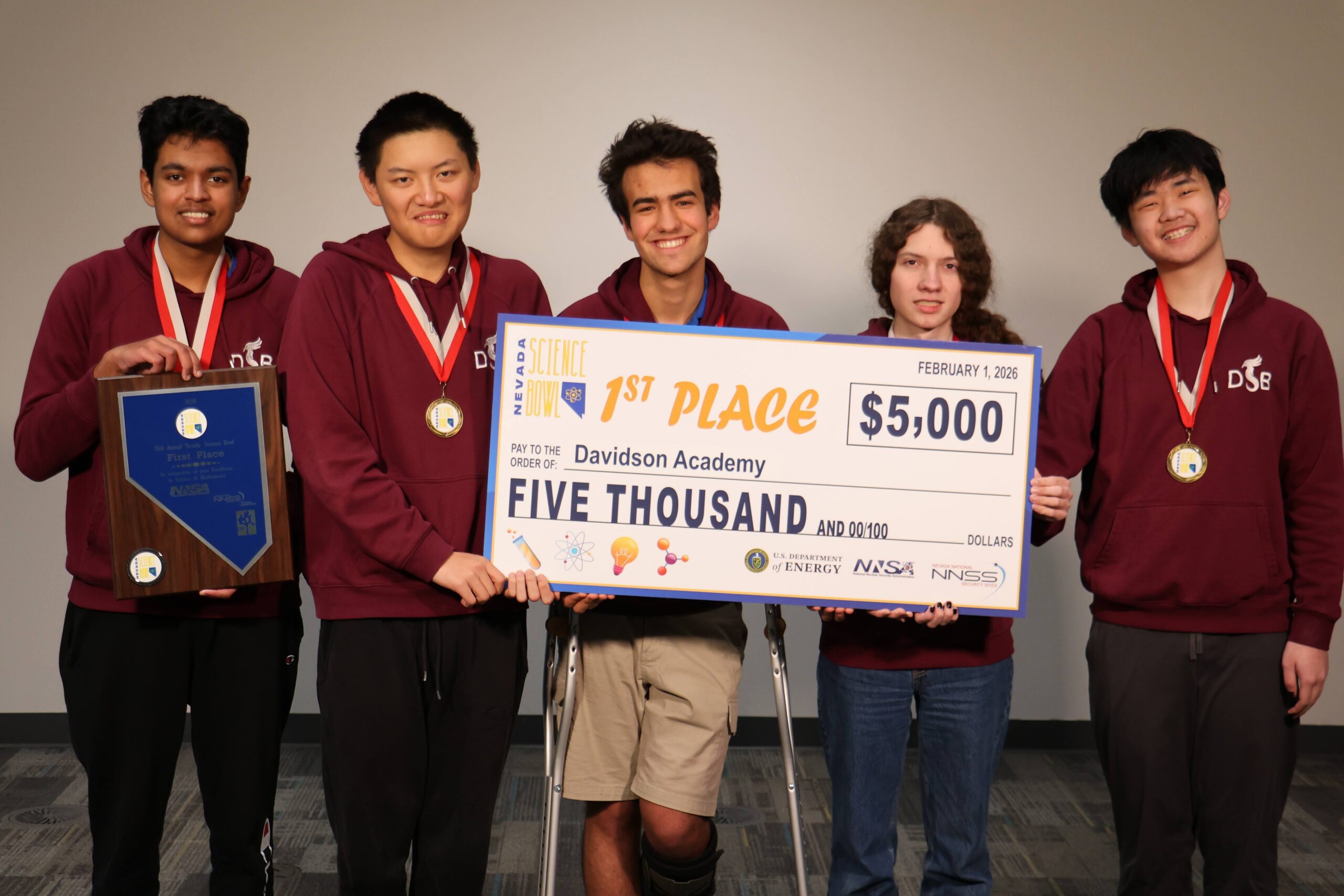 The Davidson Academy Science Bowl Club’s Team A took first place at the 35th annual Nevada Science Bowl, held in Las Vegas on January 31. Competing in a 24-team field, the team—Alexander Weaver, Filip Ramazan, Julian Kuang, Lucas Wu, and Yajur Chandar—earned $5,000 in prize money and an all-expenses-paid trip to Washington, D.C., where they will represent Nevada at the 36th annual National Science Bowl Finals this spring.